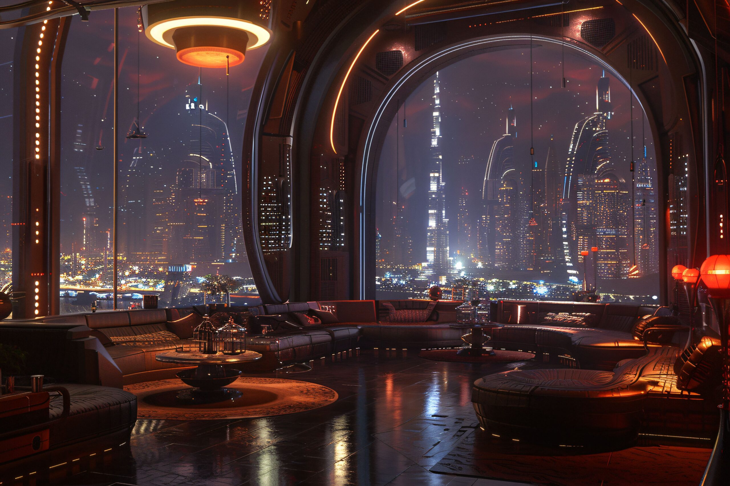 Ultra-modern NYC penthouse with floor-to-ceiling windows overlooking Manhattan skyline at sunset, cinematic ultra-realistic style.